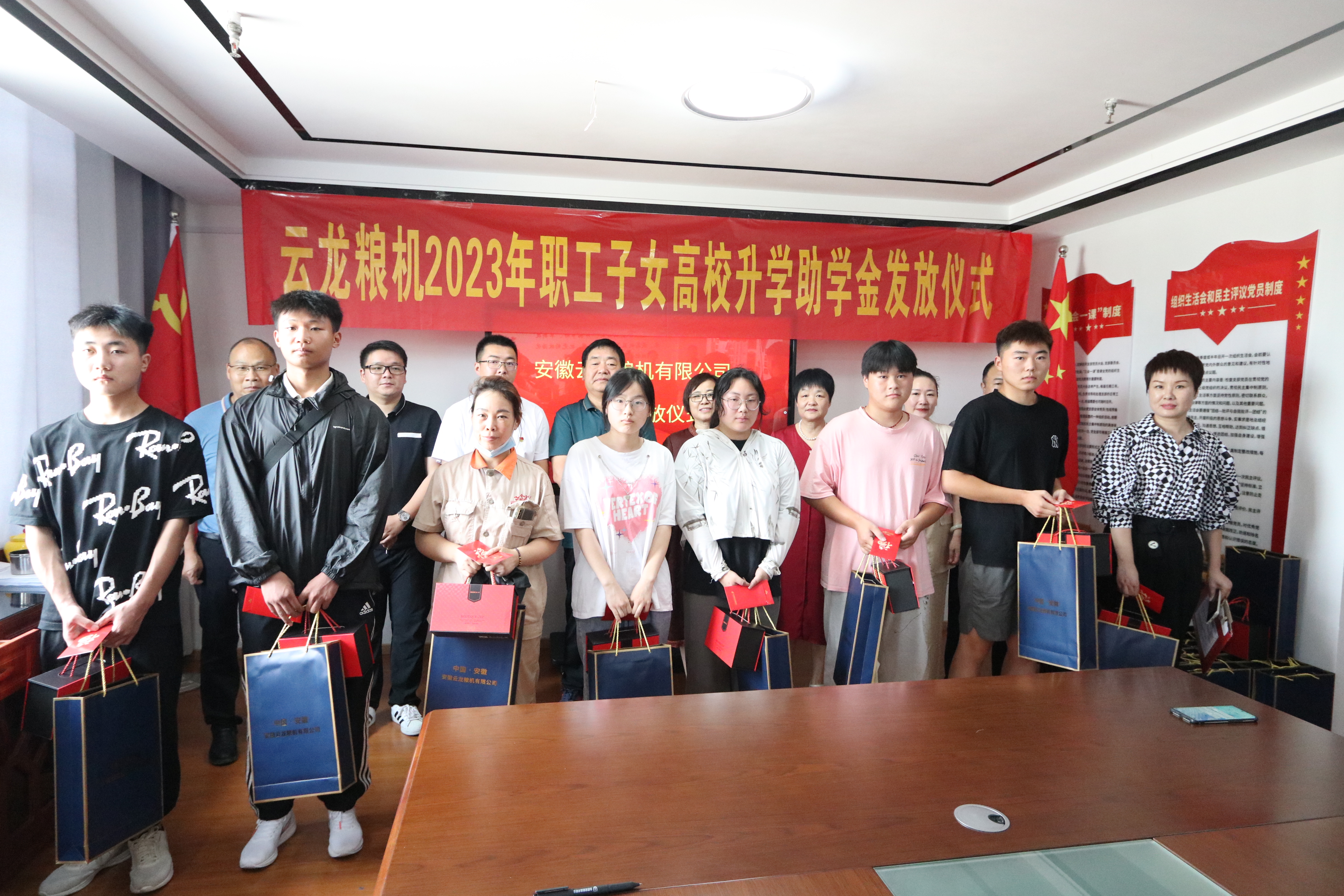 8月22日上午,我公司在三楼会议室举行“云龙粮机2023年职工子女高校升学助学金” 发放仪式,公司领导代表曹鹏飞董事长对升入高校的职工子女表示祝贺,并向他们发放助学金和慰问品,希望他们努力学习,绽放青春,接续温暖,回报社会。