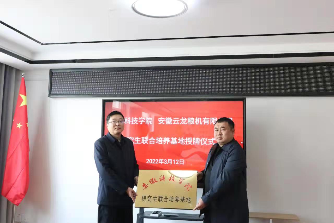 上级领导一行与安徽云龙粮机有限公司曹鹏飞董事长,在云龙集团举行“研究生联合培养基地”授牌仪式。校方和企业以此为契机,以研究生培养基地为纽带,深度开展校企合作,为企业高质量快速发展提供科技动力!