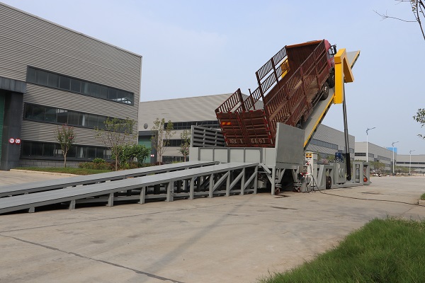 当车辆驶入平台后,升降挡轮装置至位置传感器生效后,车辆开始倒车使车尾轮靠紧挡轮装置,即可以开启车门进行卸车。当车门完全打开粮食自流结束时,即可以启动翻板,将车辆缓缓举升,直至粮食完全卸完,操作平台下降。全过程由遥控器操作完成。