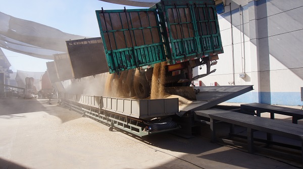 移动式侧卸平台卸车功能:调整平台处于平整地面,并保证承重架体充分落地,然后将两端引桥挂接在平台两端,即完成平台定位。当车辆驶入平台后,即可以开启车门进行卸车,然后再开启动防侧滑和防侧翻在装置将车辆固定安全。当侧面们完全打开粮食自流结束时,即可以启动翻版,将车辆缓缓举升,直至粮食完全卸完。卸车台侧面配合有卸粮输送机。全过程由遥控器操作完成。